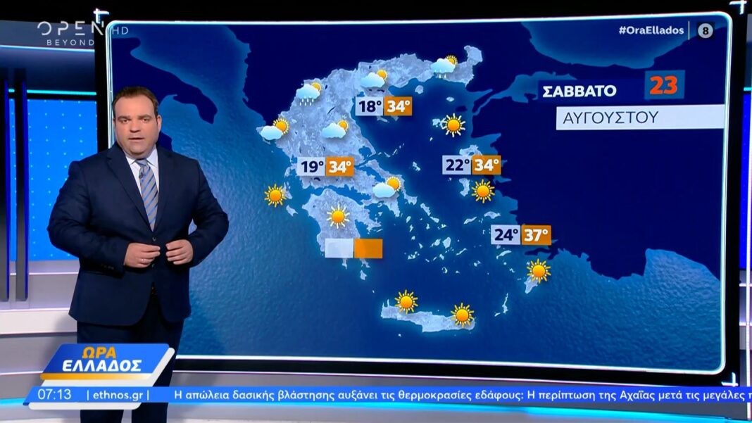 Σήμερα, ο καιρός αναμένεται να είναι συννεφιασμένος σε μεγάλο μέρος της χώρας, με πιθανές βροχοπτώσεις σε ορισμένες περιοχές. Η θερμοκρασία θα σημειώσει πτώση, με τις μέγιστες τιμές να κυμαίνονται από 32 έως 34 βαθμούς Κελσίου στα δυτικά και βόρεια ηπειρωτικά και από 35 έως 37 βαθμούς στα υπόλοιπα ηπειρωτικά.