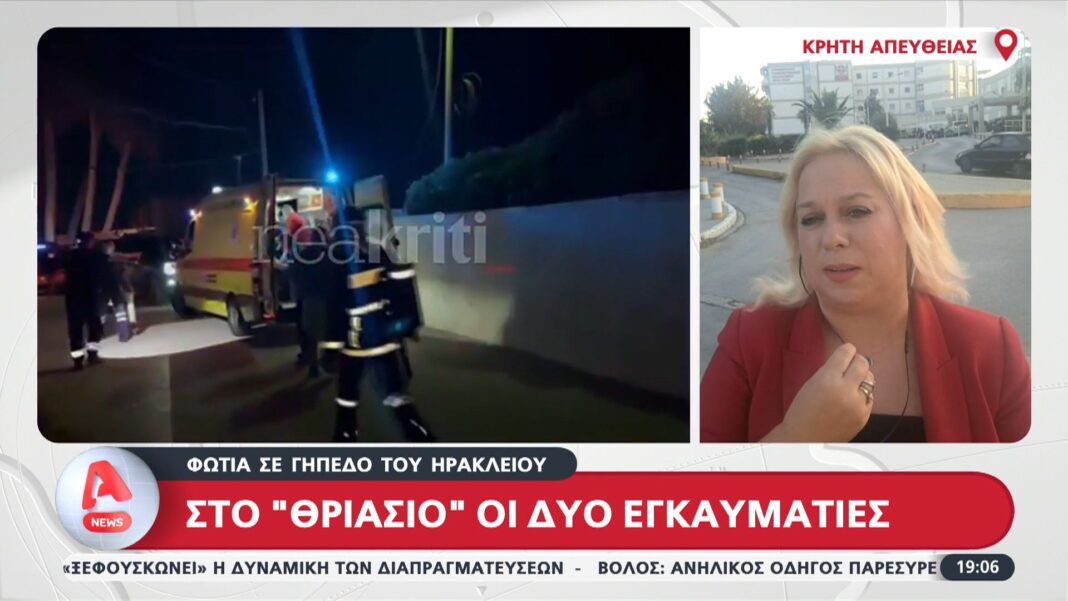 Δύο άτομα νοσηλεύονται σε κρίσιμη κατάσταση στο «Θριάσιο» μετά από σοβαρούς εγκαυματισμούς που υπέστησαν από φωτιά που ξέσπασε σε γήπεδο στην Αμμουδάρα Ηρακλείου Κρήτης. Η φωτιά ξέσπασε κατά τη διάρκεια αθλητικής εκδήλωσης, προκαλώντας πανικό στους παρευρισκόμενους.
