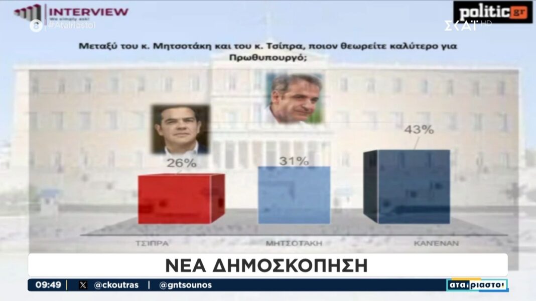 Μια νέα δημοσκόπηση δείχνει ότι ο “Κανένας” θεωρείται ο καταλληλότερος πρωθυπουργός από τους πολίτες, με τα ποσοστά των υπαρχόντων υποψηφίων να είναι χαμηλότερα. Ο Κυριάκος Μητσοτάκης προηγείται με 31%, ενώ ο Αλέξης Τσίπρας ακολουθεί με 26%.