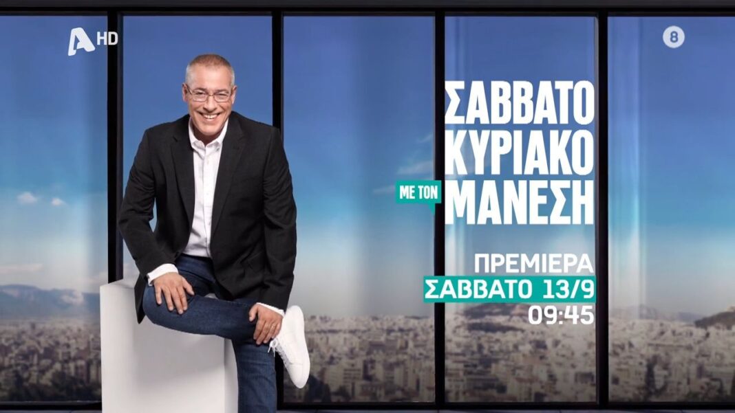 Ο Νίκος Μάνεσης επιστρέφει στην τηλεόραση, προσφέροντας στους τηλεθεατές του μια νέα σειρά εκπομπών κάθε Σαββατοκύριακο. Η πρεμιέρα θα πραγματοποιηθεί το Σάββατο 13 Σεπτεμβρίου, και οι θεατές θα έχουν την ευκαιρία να παρακολουθήσουν ενδιαφέροντα θέματα και αναλύσεις της επικαιρότητας.