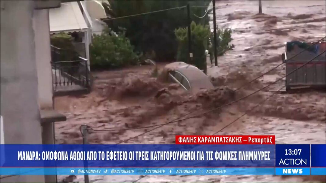 Ομόφωνα αθώοι κρίθηκαν τρεις κατηγορούμενοι για τη φονική πλημμύρα που έπληξε τη Μάνδρα το 2017, σύμφωνα με απόφαση του Τριμελούς Εφετείου Πλημμελημάτων. Οι κατηγορίες αφορούσαν ανθρωποκτονία από αμέλεια, αλλά το δικαστήριο δεν βρήκε επαρκή στοιχεία για να τους καταδικάσει.