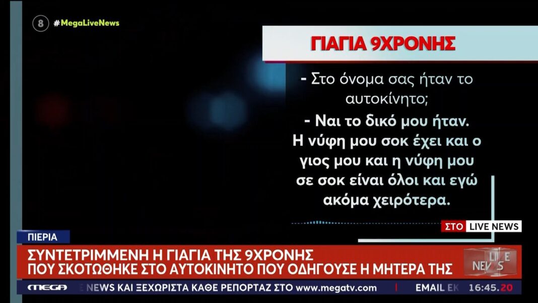 Συντετριμμένη παραμένει η οικογένεια της 9χρονης που έχασε τη ζωή της σε τροχαίο στην Πιερία. Η γιαγιά της, εκφράζοντας τον πόνο της, ανέφερε ότι η νύφη της και ο γιος της βρίσκονται σε σοκ, ενώ η ίδια βιώνει ακόμη πιο έντονα την τραγωδία.