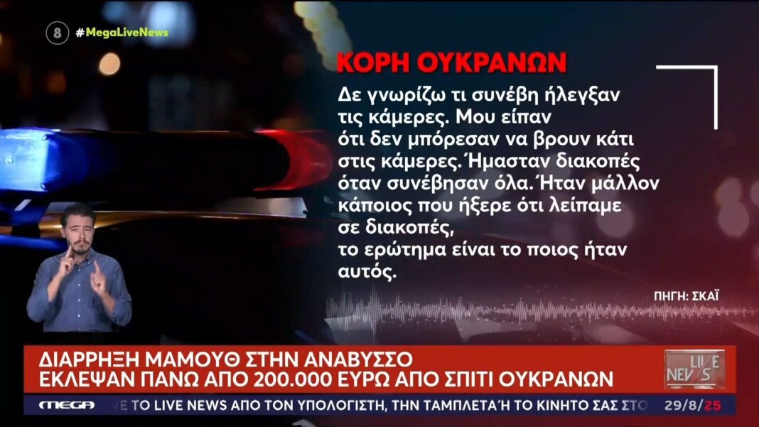 Στην Ανάβυσσο, σημειώθηκε μια σοβαρή διάρρηξη, με τους δράστες να κλέβουν πάνω από 200.000 ευρώ από την οικία μιας οικογένειας Ουκρανών, που διαμένει στην Ελλάδα τα τελευταία πέντε χρόνια. Οι κακοποιοί εισήλθαν στο σπίτι κατά τη διάρκεια της νύχτας, εκμεταλλευόμενοι την απουσία των ενοίκων.