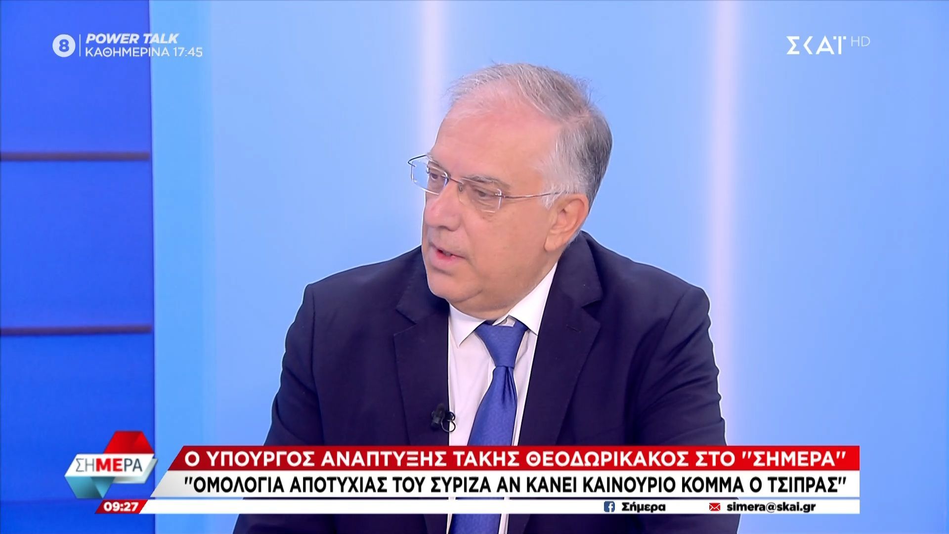 Ο Υπουργός Ανάπτυξης, Τάκης Θεοδωρικάκος, αναφέρθηκε στην πιθανότητα επιστροφής του Αλέξη Τσίπρα στην πολιτική σκηνή και την ίδρυση νέου κόμματος από τον πρώην Πρωθυπουργό. Σημείωσε ότι μια τέτοια κίνηση θα συνιστούσε ομολογία αποτυχίας για τον ΣΥΡΙΖΑ, υποδεικνύοντας την αδυναμία του να διατηρήσει τη συνοχή του.