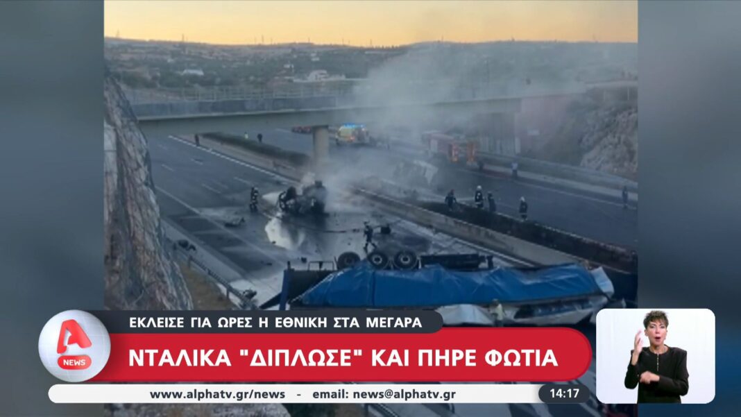 Σοβαρό τροχαίο στην Εθνική οδό Κορίνθου με νταλίκα που συγκρούστηκε, εξετράπη της πορείας της και τυλίχτηκε στις φλόγες, με τον οδηγό να νοσηλεύεται