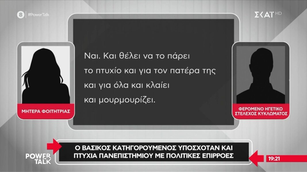Αποκαλύψεις για τη δράση του βασικού κατηγορούμενου της μαφίας της Κρήτης έρχονται στο φως, με διάλογο που αποκαλύπτει την υπόσχεση πτυχίων πανεπιστημίου μέσω πολιτικών διασυνδέσεων. Η μητέρα μιας φοιτήτριας φαίνεται να ζητάει βοήθεια για την απόκτηση πτυχίου, αποδεικνύοντας την ύπαρξη ενός οργανωμένου δικτύου που εκμεταλλεύεται την επιθυμία των φοιτητών για ακαδημαϊκή επιτυχία.