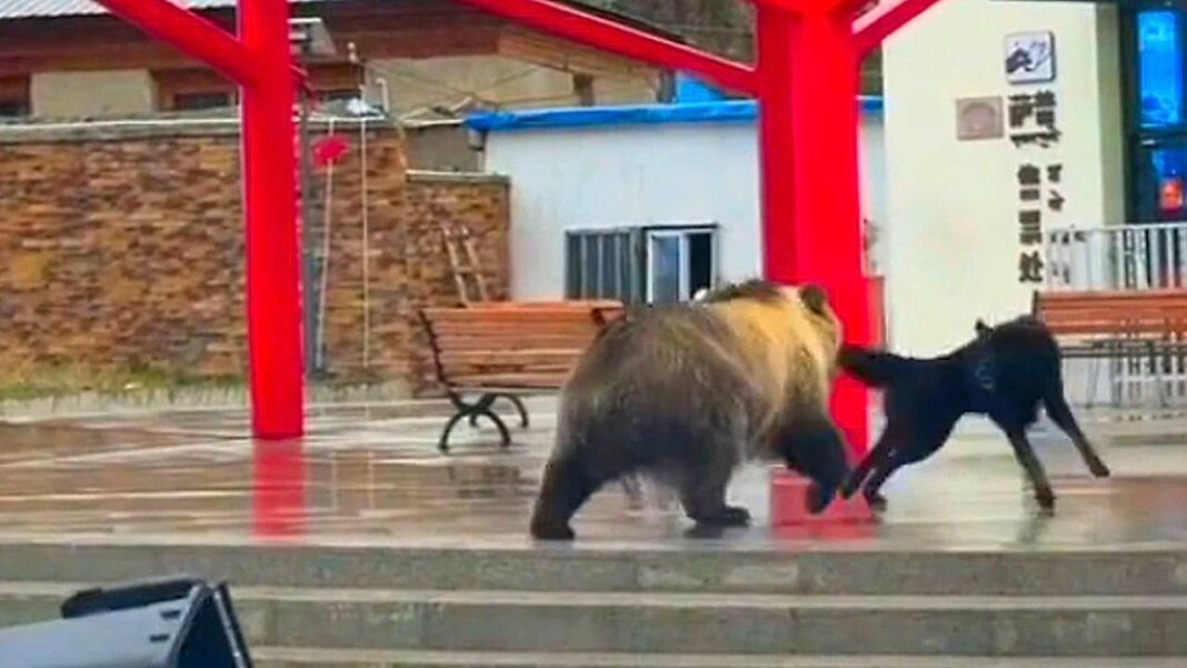 Στις 24 Αυγούστου, μια θιβετιανή καφέ αρκούδα εντοπίστηκε να ψαχουλεύει σκουπίδια κοντά σε πάρκινγκ τουριστικής περιοχής στην Ναγκού, Θιβέτ. Ένας θαρραλέος σκύλος, ωστόσο, αποφάσισε να αναλάβει δράση και να διώξει την αρκούδα, η οποία φαίνεται να ήταν περισσότερο επικεντρωμένη στα σκουπίδια παρά στον σκύλο.