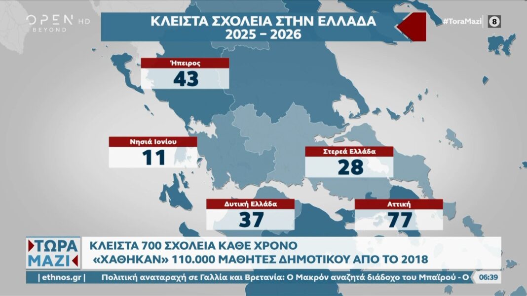 Κάθε χρόνο, περίπου 700 σχολεία στην Ελλάδα κλείνουν, με σημαντικές αποκλίσεις ανά περιοχή. Στην κεντρική Μακεδονία, για παράδειγμα, 150 σχολεία έχουν κλείσει, ενώ στη Δυτική Μακεδονία και τη Θεσσαλία οι αριθμοί ανέρχονται σε 21 και 81 αντίστοιχα.