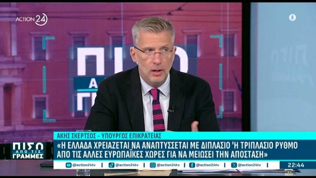Ο Άκης Σκέρτσος τονίζει την ανάγκη για ταχεία ανάπτυξη της ελληνικής οικονομίας, προκειμένου να μειωθεί η απόσταση με τις υπόλοιπες χώρες της Ευρώπης. Αναφέρει ότι η Ελλάδα πρέπει να επιτύχει ρυθμούς ανάπτυξης διπλάσιους ή τριπλάσιους από τους σημερινούς, ώστε να καταστεί πιο ανταγωνιστική και βιώσιμη.