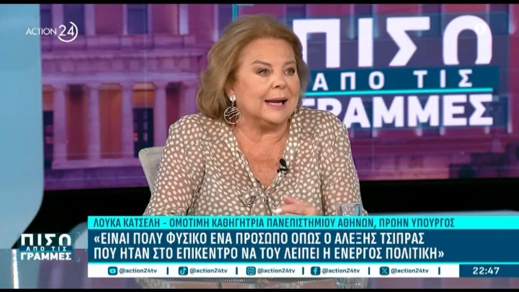 Η πρώην Υπουργός Λούκα Κατσέλη αναλύει τη σημασία της ενεργής πολιτικής για πολιτικούς ηγέτες που έχουν βρεθεί στο προσκήνιο, όπως ο Αλέξης Τσίπρας. Σημειώνει ότι είναι φυσικό για έναν τέτοιο ηγέτη να αισθάνεται την ανάγκη να συμμετέχει ξανά στη δημόσια ζωή, δεδομένου του ρόλου που έχει διαδραματίσει στο παρελθόν.