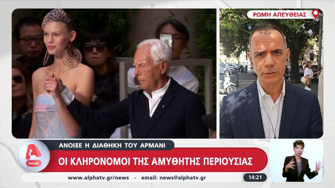 Η διαθήκη του γνωστού Ιταλού σχεδιαστή μόδας έχει πλέον ανοίξει, αποκαλύπτοντας τους κληρονόμους της αμύθητης περιουσίας του. Ο Θεόδωρος Ανδρεάδης Συγγελάκης, ανταποκριτής μας στη Ρώμη, μεταφέρει τις τελευταίες πληροφορίες για το μέλλον των περιουσιακών στοιχείων και των επιχειρήσεων του Αρμάνι.