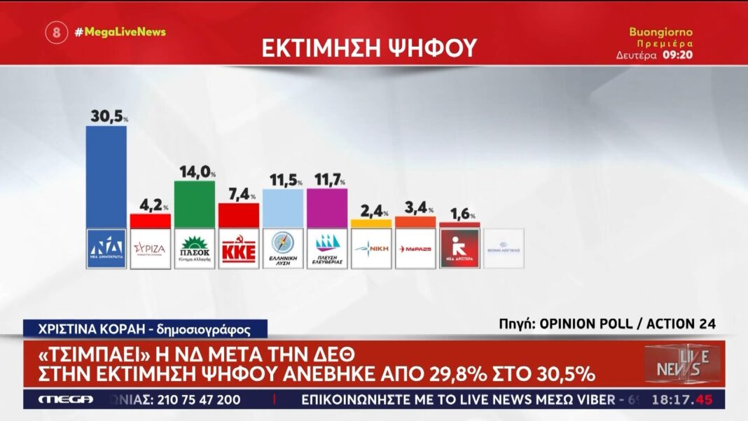 Η νέα δημοσκόπηση δείχνει ότι η Νέα Δημοκρατία κερδίζει έδαφος μετά την πρόσφατη ΔΕΘ, με την εκτίμηση ψήφου να δείχνει αύξηση της υποστήριξής της. Αντίθετα, ο ΣΥΡΙΖΑ φαίνεται να χάνει έδαφος, μειώνοντας την εκλογική του επιρροή.