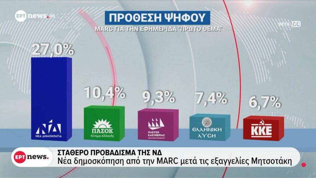 Νέα δημοσκόπηση από την MARC αποκαλύπτει ότι η Νέα Δημοκρατία διατηρεί σταθερό προβάδισμα έναντι του ΣΥΡΙΖΑ, μετά τις πρόσφατες εξαγγελίες του πρωθυπουργού Κυριάκου Μητσοτάκη. Η στήριξη του κυβερνώντος κόμματος φαίνεται να παραμένει ισχυρή, με τους πολίτες να εκφράζουν θετικές απόψεις για τις πολιτικές που προτείνονται.