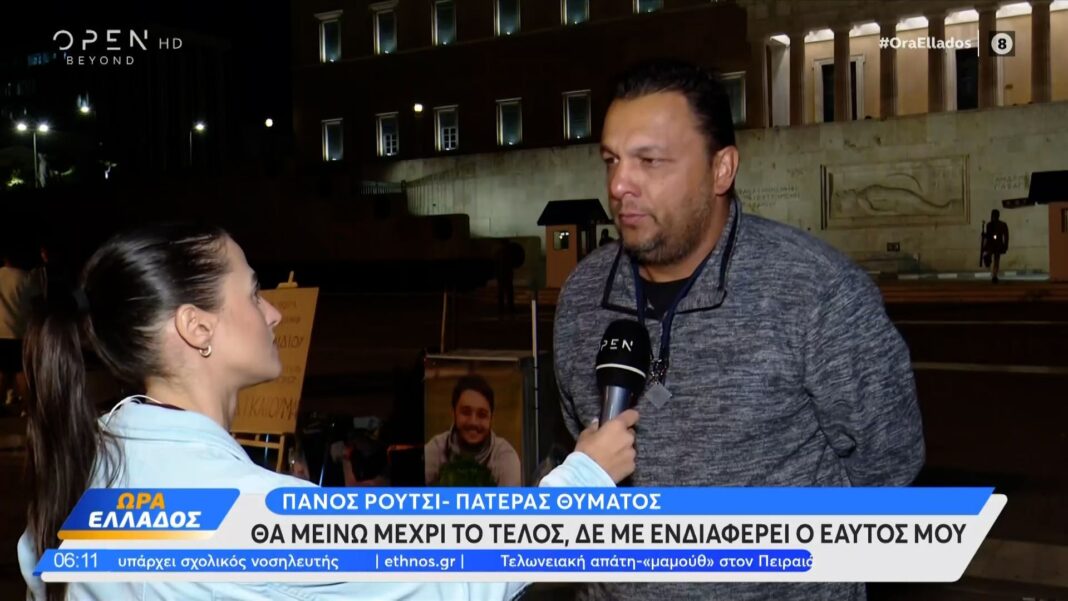 Πατέρας θύματος της τραγωδίας στα Τέμπη ξεκίνησε απεργία πείνας έξω από τη Βουλή, εκφράζοντας την αγανάκτησή του για την καθυστέρηση της διαδικασίας εκταφής του παιδιού του. Απαιτεί την άδεια εκταφής, δηλώνοντας ότι είναι απαραίτητη για να μπορέσει να αποχαιρετήσει τον γιο του και να βρει δικαίωση.