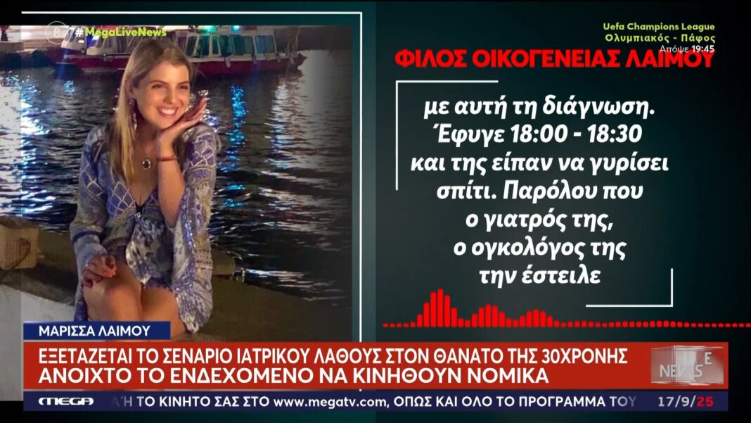 Σήμερα αναμένεται το πόρισμα του ιατροδικαστή για τον θάνατο της Μαρίσσας Λαιμού, που έχει προκαλέσει έντονες αντιδράσεις στην κοινή γνώμη. Η οικογένεια εξετάζει το ενδεχόμενο νομικών ενεργειών, καθώς υπάρχουν υποψίες για ιατρικό λάθος που μπορεί να σχετίζεται με την υπόθεση.