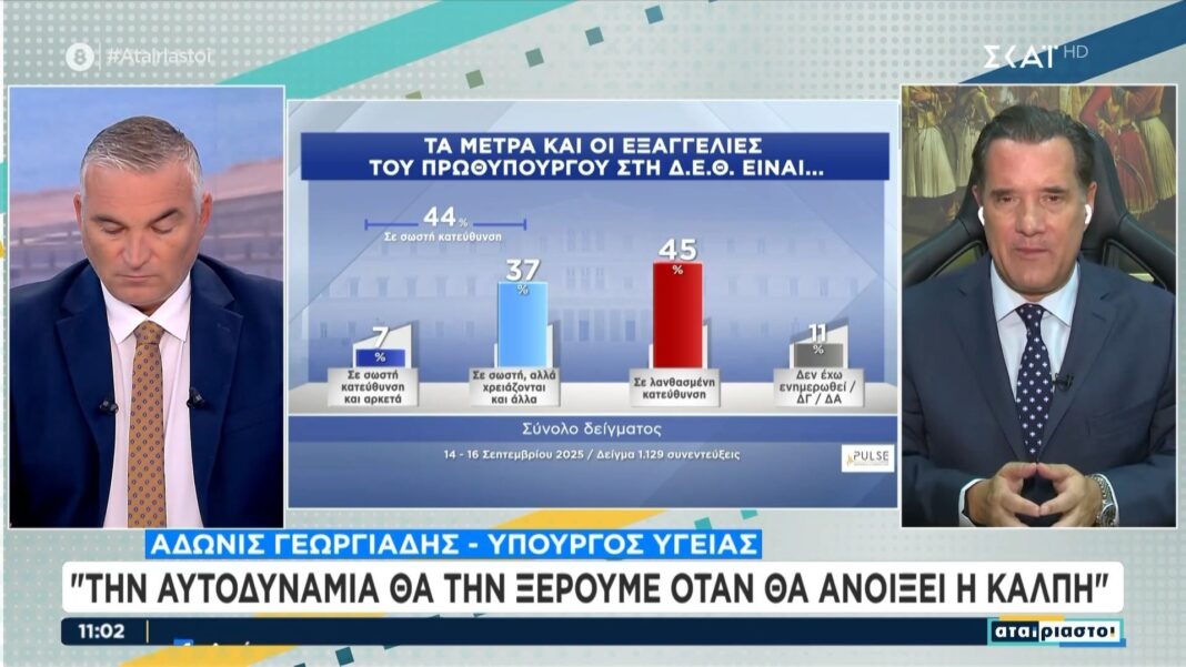 Ο υπουργός Υγείας, Άδωνις Γεωργιάδης, αναφέρθηκε στην απήχηση των πρόσφατων μέτρων που έχουν ληφθεί και εξέφρασε την ικανοποίησή του για την υποστήριξη που αυτά έλαβαν από το κοινό. Σύμφωνα με τον ίδιο, τα ποσοστά αποδοχής είναι πολύ καλύτερα από τις αρχικές του προσδοκίες, γεγονός που δείχνει τη θετική στάση των πολιτών απέναντι στις πολιτικές υγείας.