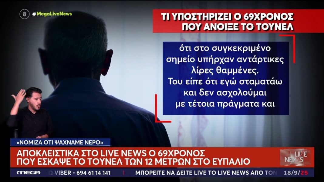 Στο Ευπάλιο, ένας 69χρονος άνδρας αποκάλυψε την ιστορία πίσω από το τούνελ των 12 μέτρων που έσκαψε μόνος του. Σε δηλώσεις του, ανέφερε ότι ποτέ δεν χρησιμοποίησε ανιχνευτή μετάλλων κατά τη διάρκεια της διαδικασίας, διαψεύδοντας φήμες που κυκλοφορούσαν σχετικά με την ανακάλυψη θησαυρού.