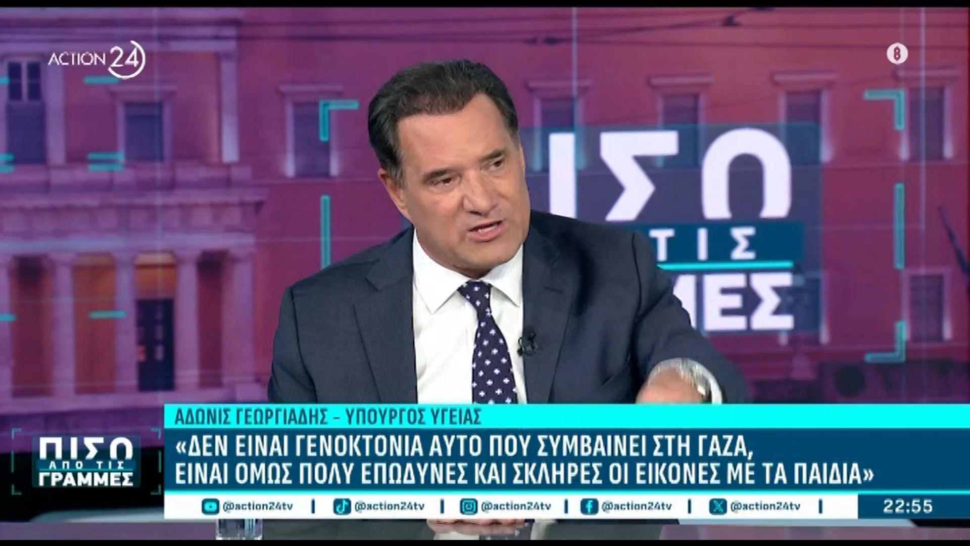 Ο Υπουργός Υγείας Άδωνις Γεωργιάδης εξέφρασε τη θέση του σχετικά με την κατάσταση στη Γάζα, δηλώνοντας ότι δεν μπορεί να χαρακτηρίσει τα γεγονότα ως γενοκτονία. Επιπλέον, τόνισε την αντίθεσή του στην ιδέα της σύλληψης του Ισραηλινού Πρωθυπουργού, Μπενιαμίν Νετανιάχου, για τις ενέργειές του κατά τη διάρκεια της σύγκρουσης.