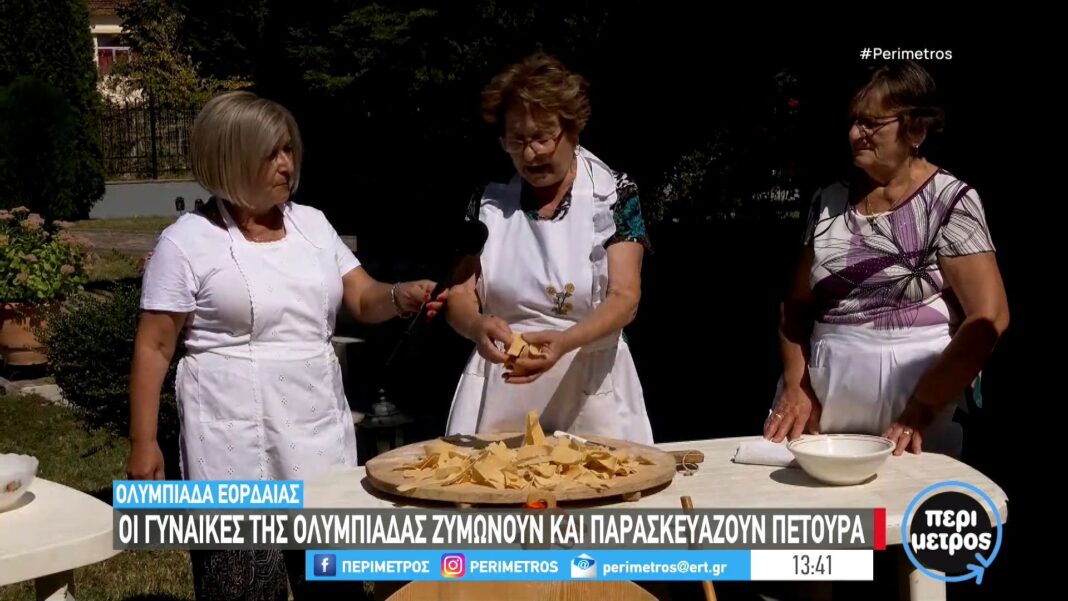 Στην Ολυμπιάδα Εορδαίας, οι ντόπιες γυναίκες επιδεικνύουν τις παραδοσιακές τους δεξιότητες στην παρασκευή πέτουρων. Με μια προσεγμένη συνταγή που περιλαμβάνει είκοσι αβγά, τρία κιλά αλεύρι και ένα κιλό γάλα, δημιουργούν ζύμη που ανοίγουν σε φύλλο, απαιτώντας ιδιαίτερη επιδεξιότητα.