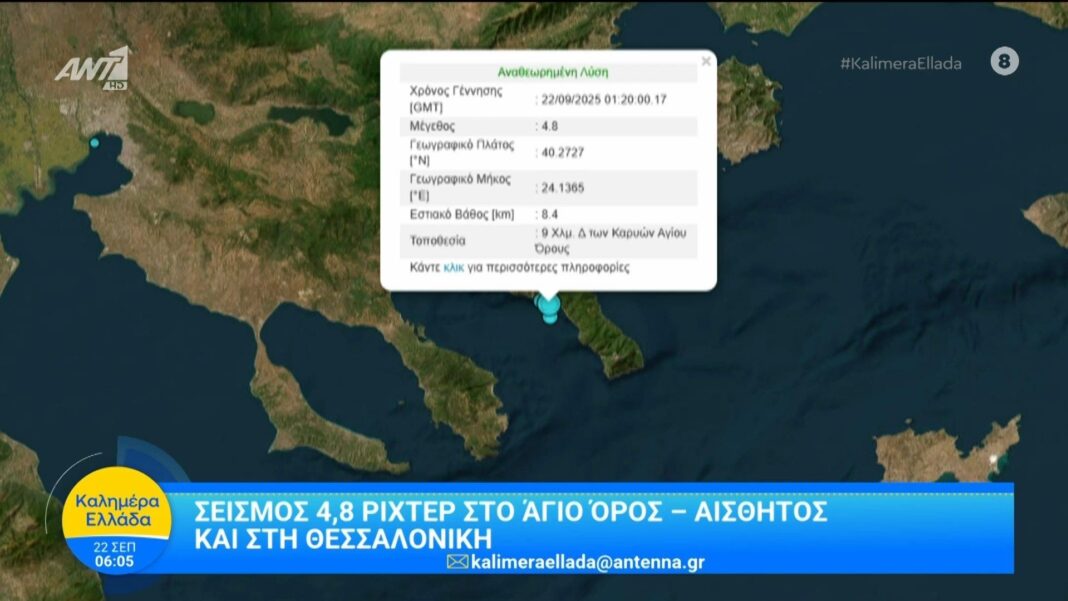 Σεισμός 4,8 Ρίχτερ σημειώθηκε στο Άγιο Όρος το πρωί της 22ης Σεπτεμβρίου 2025. Ο σεισμός έγινε αισθητός και σε κοντινές περιοχές, κυρίως στη Θεσσαλονίκη, προκαλώντας ανησυχία στους κατοίκους.