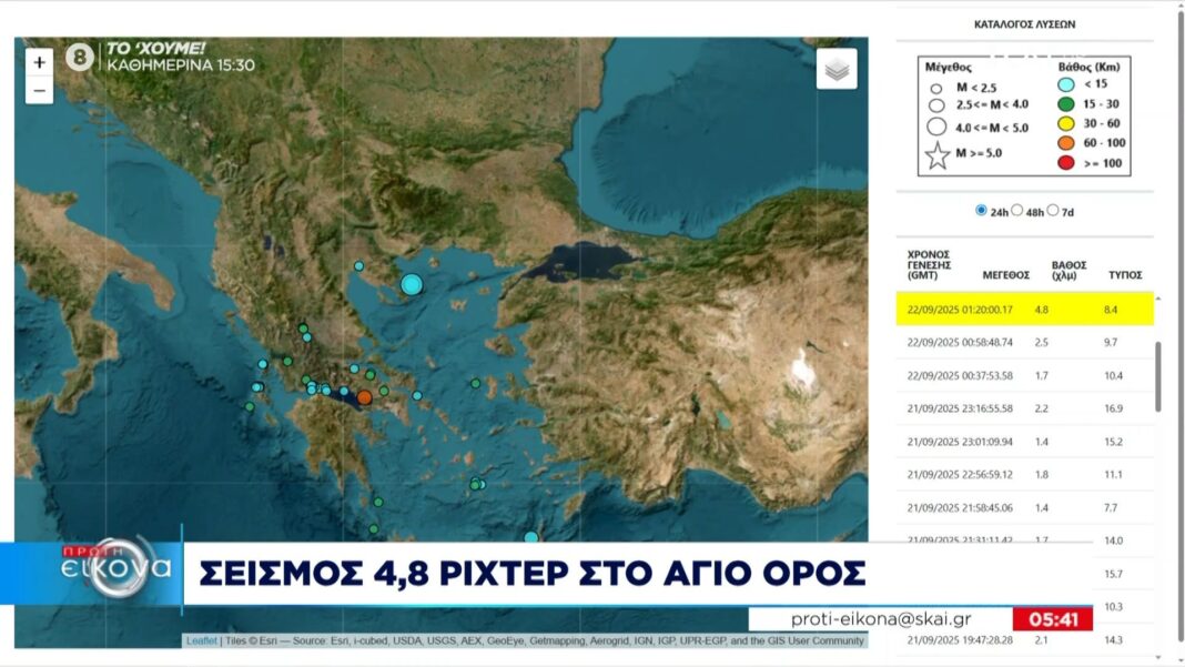 Σεισμική δόνηση 4,8 ρίχτερ σημειώθηκε στο Άγιο Όρος το πρωί της Δευτέρας, προκαλώντας ανησυχία στους κατοίκους και τους επισκέπτες της περιοχής. Η δόνηση έγινε αισθητή σε πολλές περιοχές του Αγίου Όρους, αλλά μέχρι στιγμής δεν έχουν αναφερθεί σοβαρές ζημιές ή θύματα.