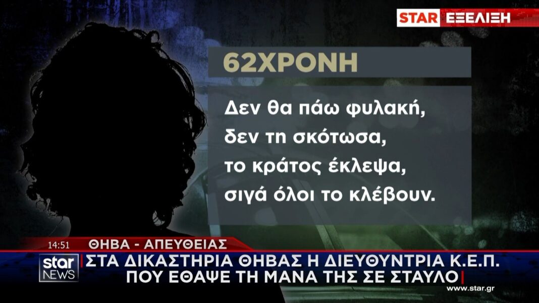 Στα δικαστήρια της Θήβας, η διευθύντρια Κ.Ε.Π. αντιμετωπίζει σοβαρές κατηγορίες για την παράνομη ταφή της μητέρας της σε σταύλο. Η υπόθεση έχει προκαλέσει αίσθηση στην τοπική κοινωνία, με την κατηγορούμενη να δηλώνει πως δεν θα υποστεί ποινές, αναφέροντας ότι «όλοι κλέβουν το κράτος».