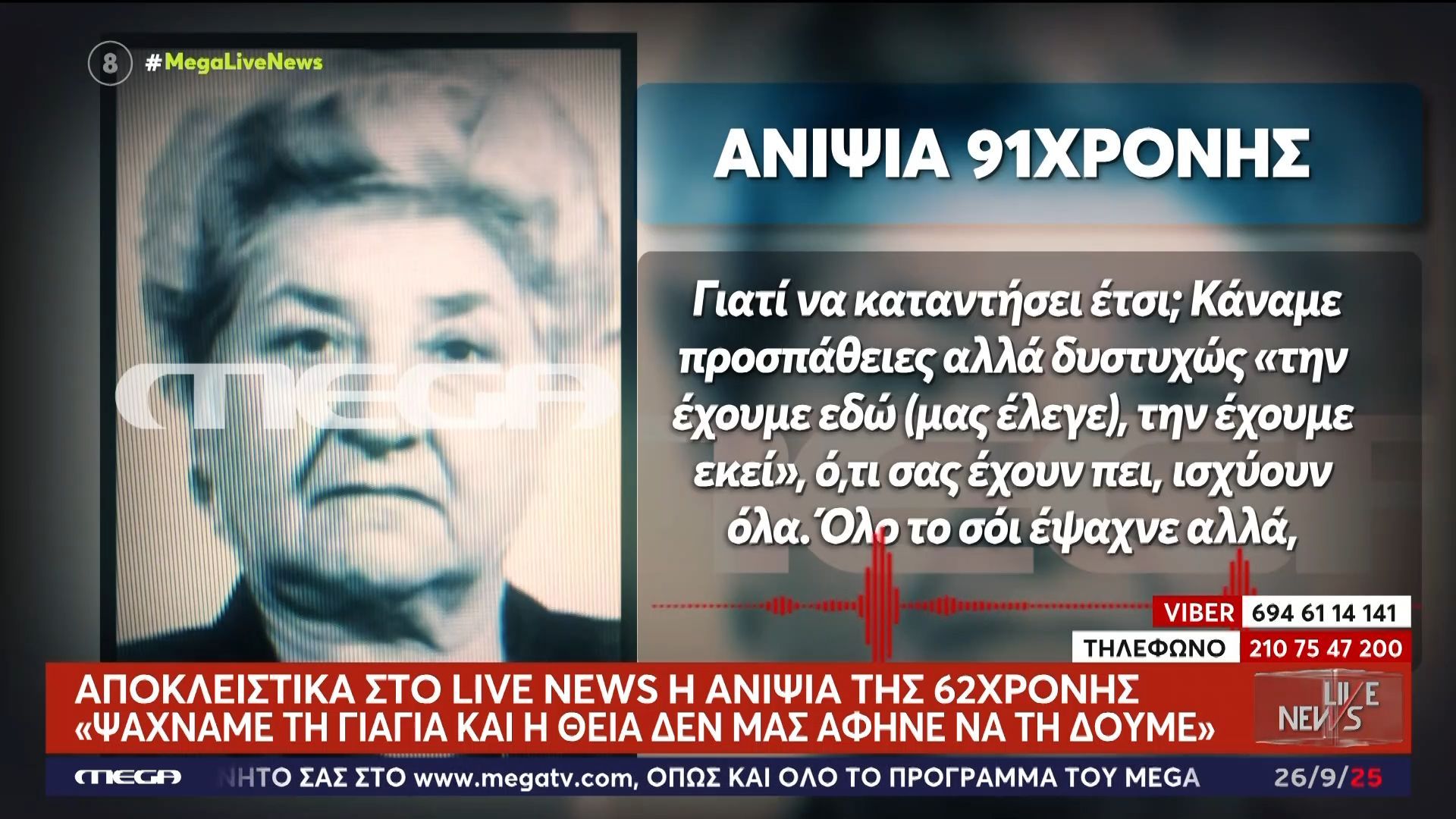 Συνεχίζονται οι έντονες εξελίξεις γύρω από την υπόθεση της 91χρονης γυναίκας στη Βοιωτία, που έχει προκαλέσει σοκ στην τοπική κοινωνία. Η ανιψιά της ηλικιωμένης αποκάλυψε ότι η θεία τους δεν τους επέτρεπε να δουν την γιαγιά τους, γεγονός που εντείνει την ανησυχία για την υγεία και την ευημερία της.