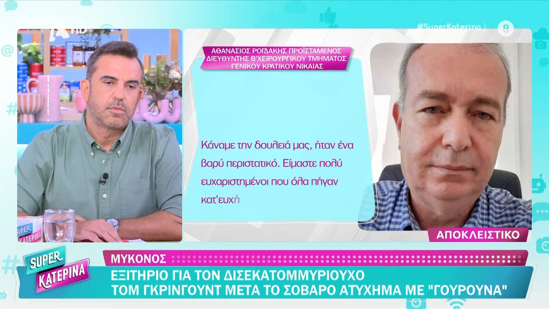 Ο Αθανάσιος Ροϊδάκης, προϊστάμενος διευθυντής του Β’ χειρουργικού τμήματος στο Γενικό Κρατικό Νίκαιας, παρέχει ενημέρωση σχετικά με την κατάσταση της υγείας του δισεκατομμυριούχου Τομ Γκρίνγουντ. Αναφέρει ότι η ομάδα του έκανε τη δουλειά της με επιτυχία, υπογραμμίζοντας τη σοβαρότητα του περιστατικού.