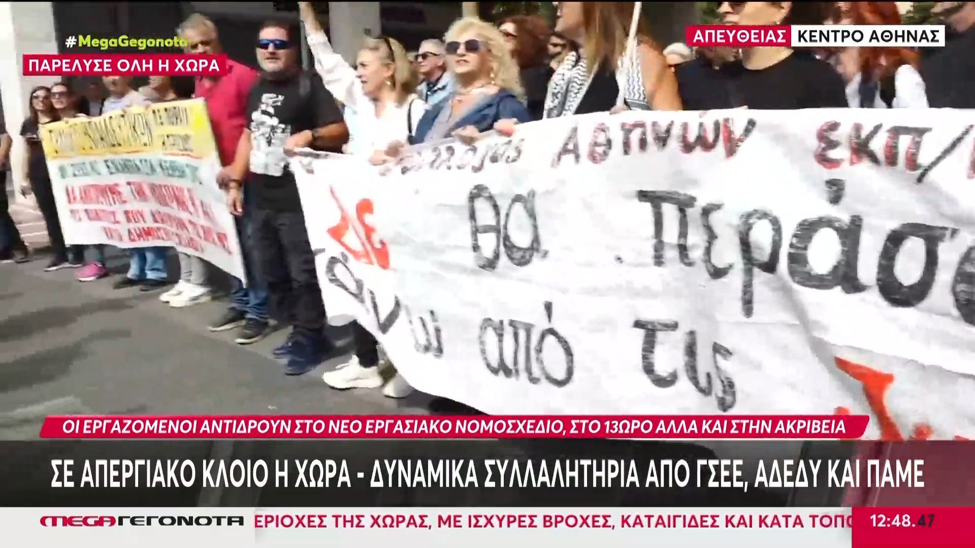 Η χώρα βιώνει σήμερα μαζικές απεργιακές κινητοποιήσεις, με τη συμμετοχή εργαζομένων από διάφορους κλάδους, οι οποίοι διαμαρτύρονται για το νέο εργασιακό νομοσχέδιο και την αύξηση της ακρίβειας. Η ΓΣΕΕ, η ΑΔΕΔΥ και το ΠΑΜΕ καλούν σε συγκεντρώσεις, διεκδικώντας καλύτερες συνθήκες εργασίας και προστασία των εισοδημάτων τους.