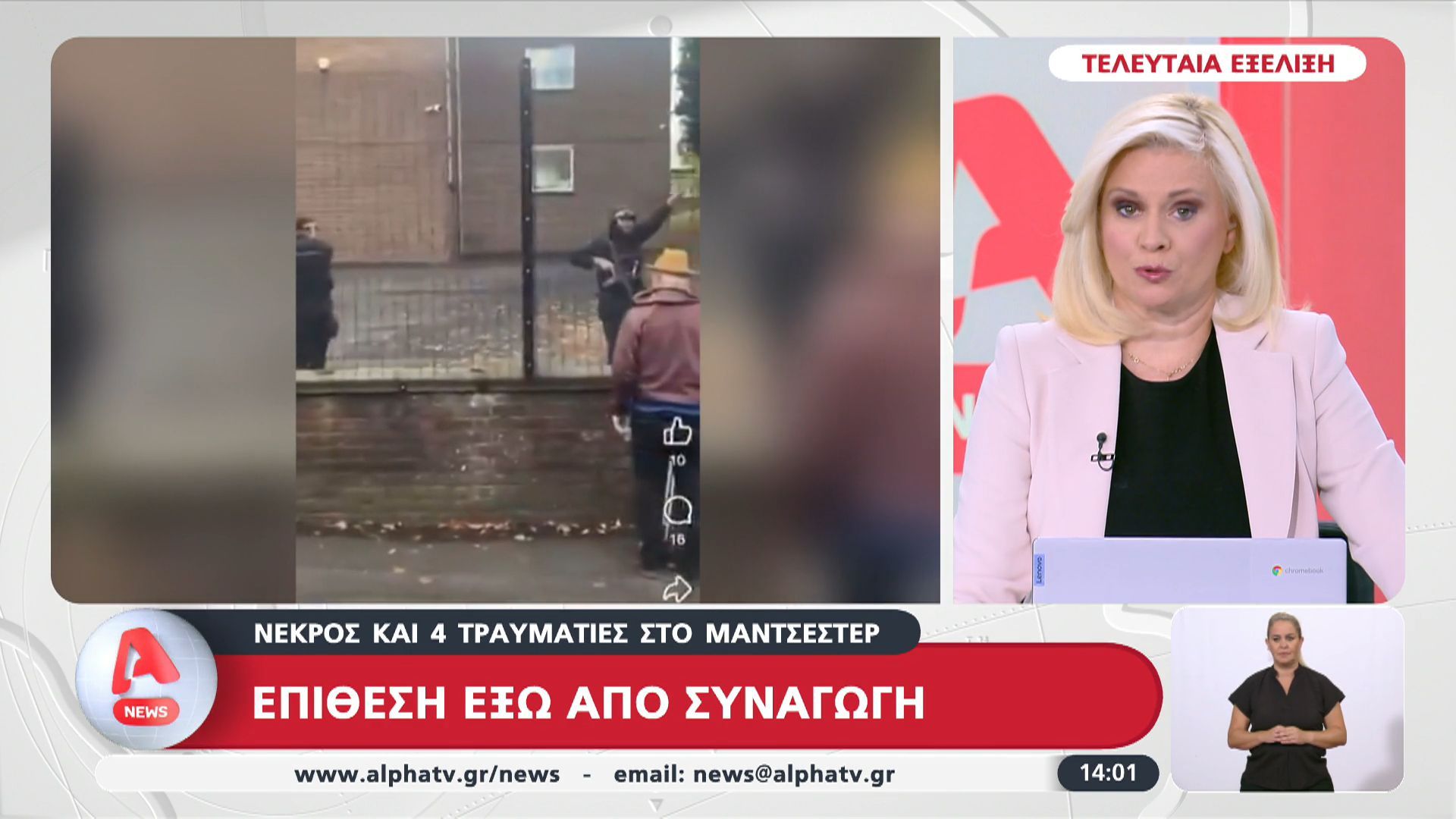 Αιματηρή επίθεση σημειώθηκε έξω από συναγωγή στο Μάντσεστερ, με αποτέλεσμα τον θάνατο ενός ατόμου και τον τραυματισμό τεσσάρων άλλων. Οι αρχές έχουν ξεκινήσει έρευνες για τα κίνητρα πίσω από την επίθεση, ενώ οι πρώτες πληροφορίες υποδεικνύουν ότι πρόκειται για μια στοχευμένη δράση.
