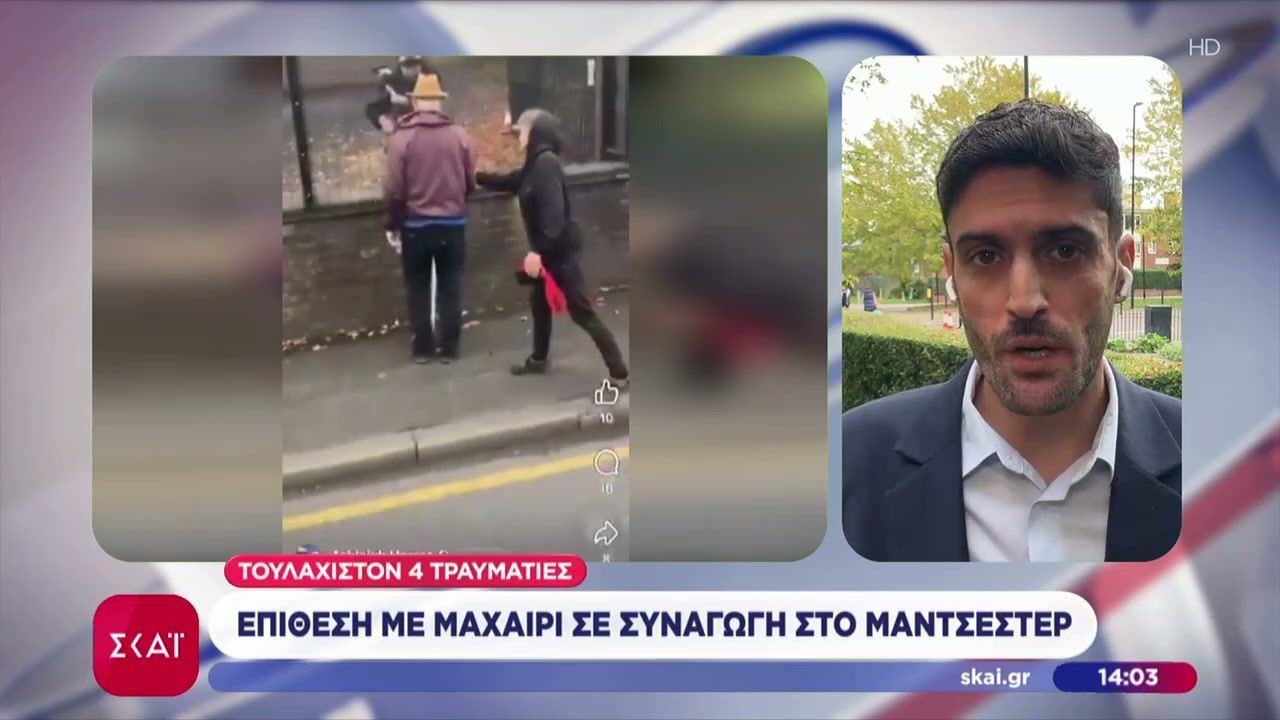 Συναγερμός σήμανε στο Μάντσεστερ μετά από επίθεση με μαχαίρι σε συναγωγή, όπου τουλάχιστον τέσσερις άνθρωποι τραυματίστηκαν. Οι αρχές έχουν προχωρήσει σε έρευνες για να διαπιστώσουν τα κίνητρα πίσω από την επίθεση, ενώ οι τραυματίες έχουν μεταφερθεί σε κοντινά νοσοκομεία.
