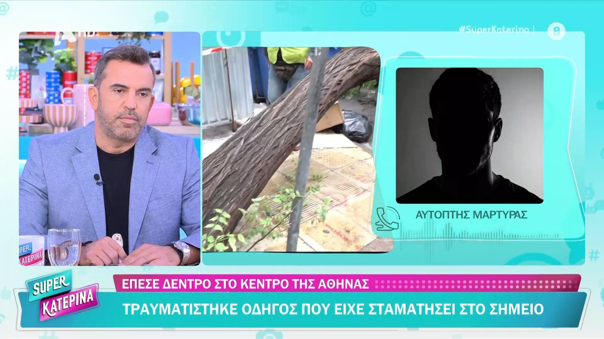 Δέντρο κατέρρευσε στο κέντρο της Αθήνας, με αποτέλεσμα να τραυματιστεί ένας οδηγός που είχε σταματήσει στο σημείο. Αυτόπτης μάρτυρας καταθέτει τις εντυπώσεις του, τονίζοντας την ξαφνικότητα του συμβάντος και την ανάγκη για προσοχή σε τέτοιες καταστάσεις.
