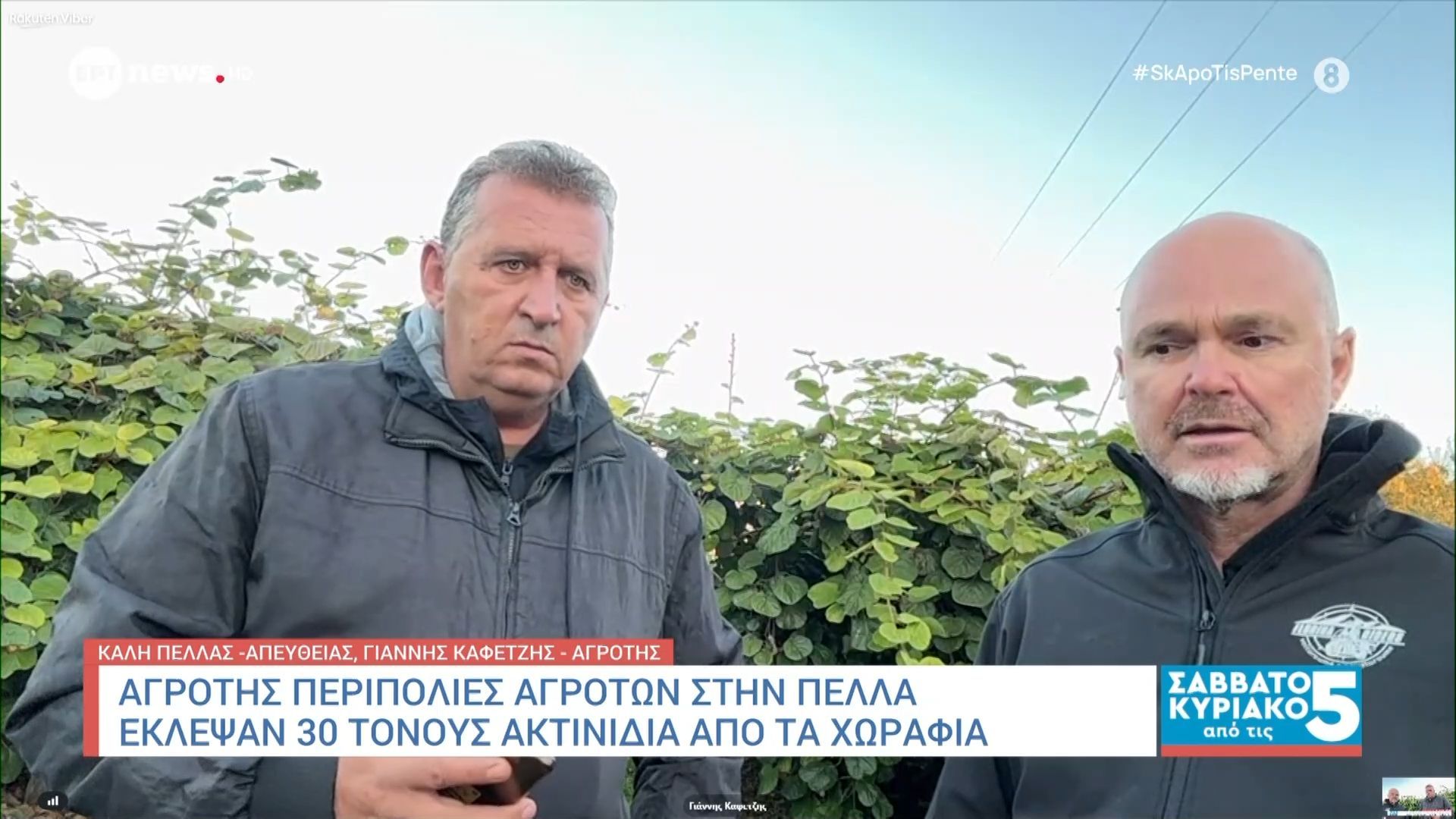 Στην Πέλλα, οι αγρότες έχουν ξεκινήσει περιπολίες για να προστατεύσουν τις καλλιέργειές τους από τις κλοπές. Πρόσφατα, σημειώθηκε κλοπή 30 τόνων ακτινιδίων από χωράφια της περιοχής, προκαλώντας ανησυχία στους παραγωγούς.