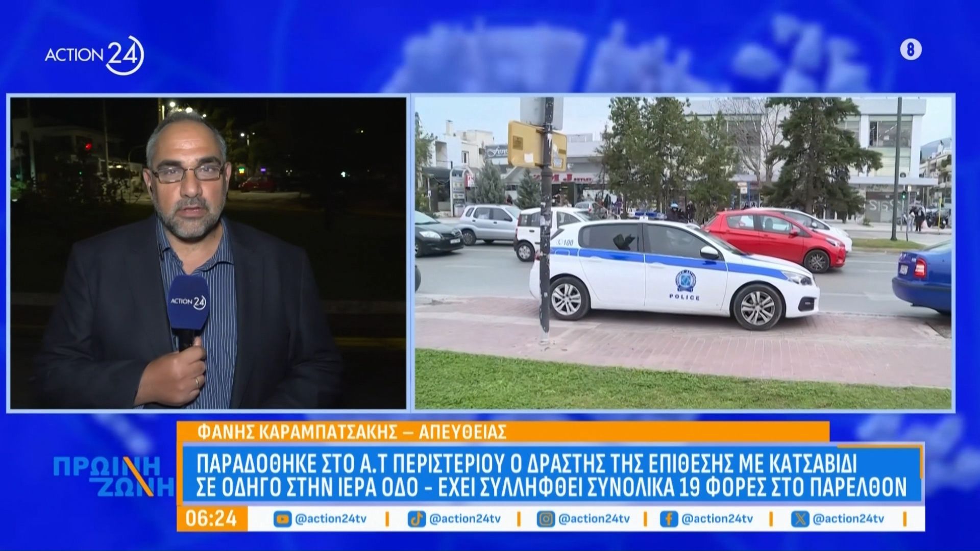 Δράστης της επίθεσης με κατσαβίδι σε οδηγό παραδόθηκε στο Α.Τ. Περιστερίου, αφού είχε συλληφθεί 19 φορές στο παρελθόν. Η επίθεση, που προκάλεσε ανησυχία στην τοπική κοινωνία, σημειώθηκε στην Ιερά Οδό, με τον δράστη να επιδεικνύει επικίνδυνη συμπεριφορά.