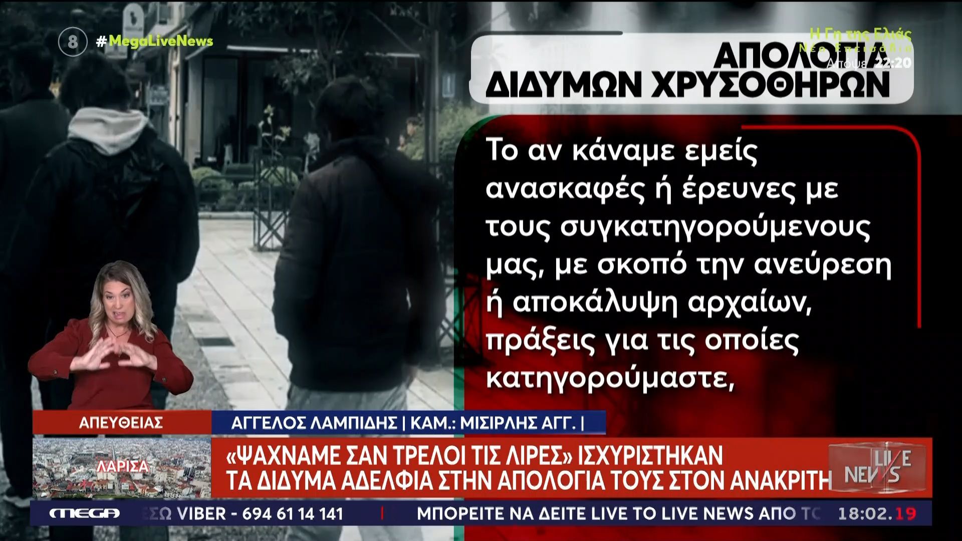 Δίδυμα αδέλφια από τη Λάρισα βρέθηκαν ενώπιον του ανακριτή, όπου αποκάλυψαν τις προθέσεις τους σχετικά με την αναζήτηση χρυσών λιρών. Σε μια απολογία που προκάλεσε αίσθηση, δήλωσαν ότι «ψάχναμε σαν τρελοί τις λίρες», προσπαθώντας να εξηγήσουν τις κινήσεις τους.