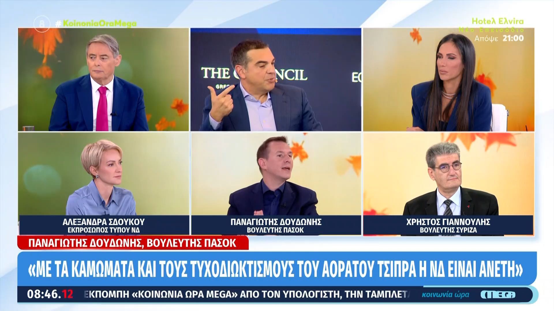 Στην εκπομπή «Κοινωνία Ώρα MEGA», οι πολιτικοί εκπρόσωποι της ΝΔ, του ΠΑΣΟΚ και του ΣΥΡΙΖΑ συζητούν τις τρέχουσες πολιτικές εξελίξεις. Ο Παναγιώτης Δουδώνης αναφέρθηκε στις στρατηγικές του ΣΥΡΙΖΑ, υποστηρίζοντας ότι οι «τυχοδιωκτισμοί» του αόρατου ηγέτη του κόμματος δεν επηρεάζουν την άνεση της ΝΔ στην πολιτική σκηνή.