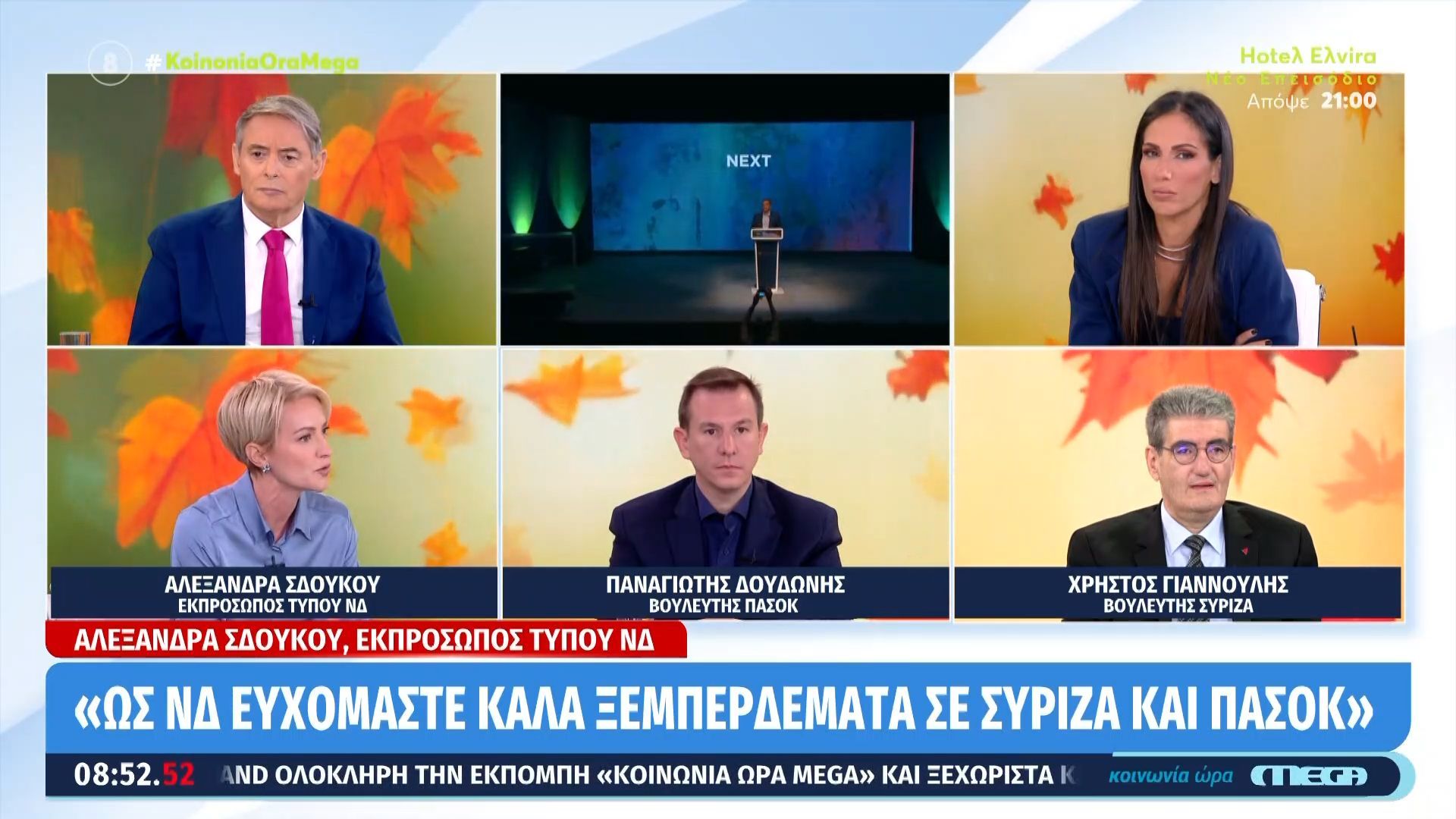 Η Αλεξάνδρα Σδούκου, εκπρόσωπος Τύπου της Νέας Δημοκρατίας, εξέφρασε την ευχή του κόμματος για θετική εξέλιξη των διαδικασιών που αφορούν τον ΣΥΡΙΖΑ και το ΠΑΣΟΚ. Η δήλωσή της έγινε κατά τη διάρκεια της συμμετοχής της στην εκπομπή «Κοινωνία Ώρα MEGA», όπου αναλύθηκαν οι πολιτικές εξελίξεις στην Ελλάδα.
