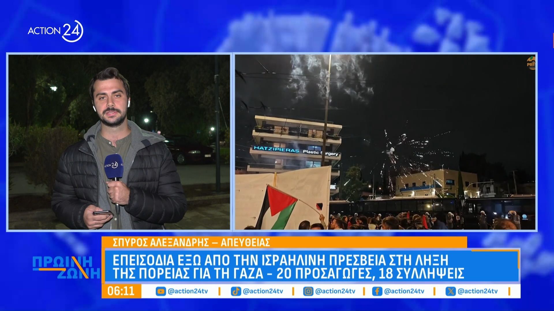 Ένταση επικράτησε έξω από την Ισραηλινή Πρεσβεία, καθώς διαδηλωτές συγκεντρώθηκαν στο πλαίσιο πορείας για τη Γάζα. Οι διαμαρτυρίες κατέληξαν σε επεισόδια, με τις δυνάμεις ασφαλείας να επεμβαίνουν για να αποκαταστήσουν την τάξη.