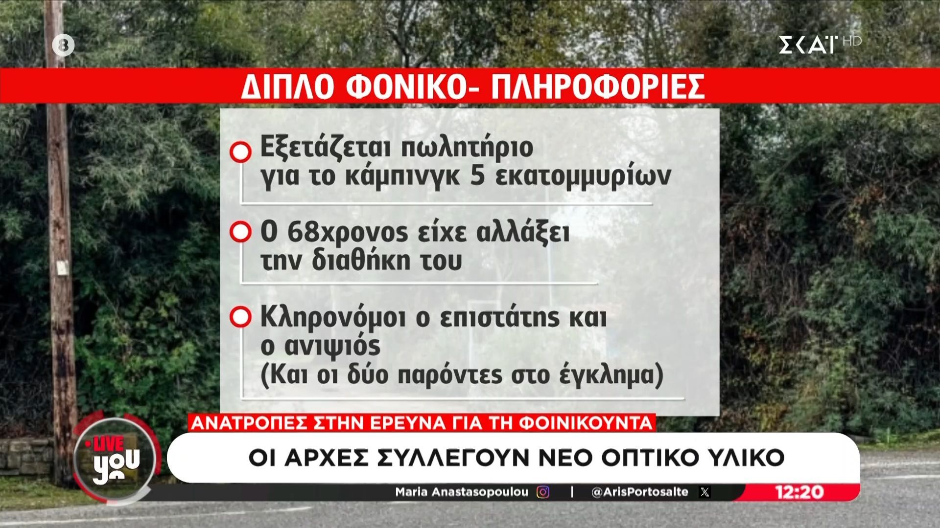 Νέες πληροφορίες σχετικά με το διπλό φονικό που συγκλόνισε τη Φοινικούντα έρχονται στο φως, καθώς οι Αρχές συνεχίζουν τις έρευνες. Το οπτικό υλικό που συλλέγεται θα μπορούσε να ρίξει φως στις συνθήκες που οδήγησαν στην τραγική αυτή υπόθεση.