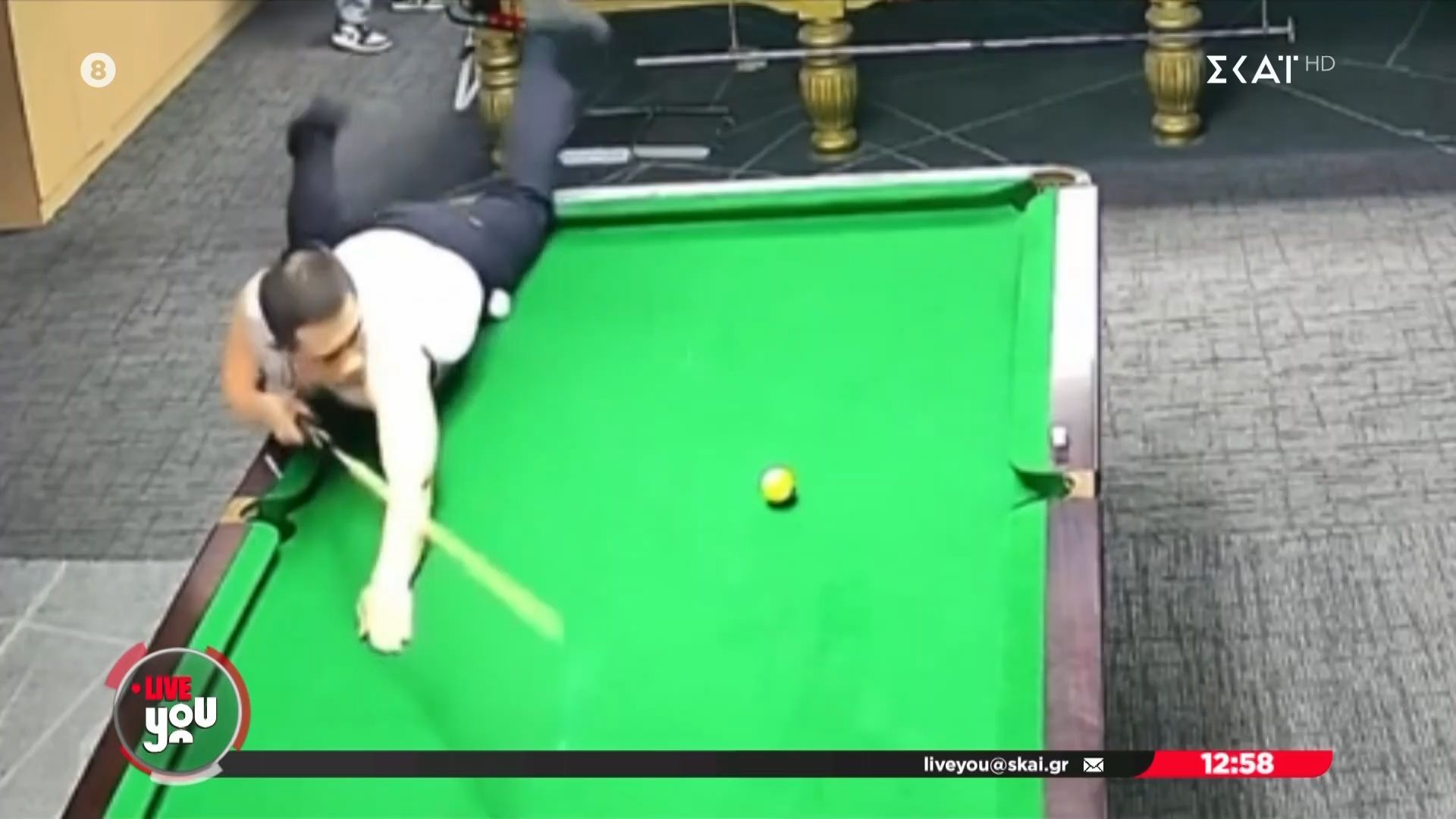 Ένα ασυνήθιστο περιστατικό συνέβη σε μπιλιάρδο, όταν ένας παίκτης χτύπησε τη μπάλα και αυτή κατέληξε να γυρνά σε μια απροσδόκητη κατεύθυνση. Αντί να μπει στην τρύπα του τραπεζιού, η μπάλα βρέθηκε στην τσέπη του άνδρα, προκαλώντας έκπληξη και γέλιο στους θεατές.