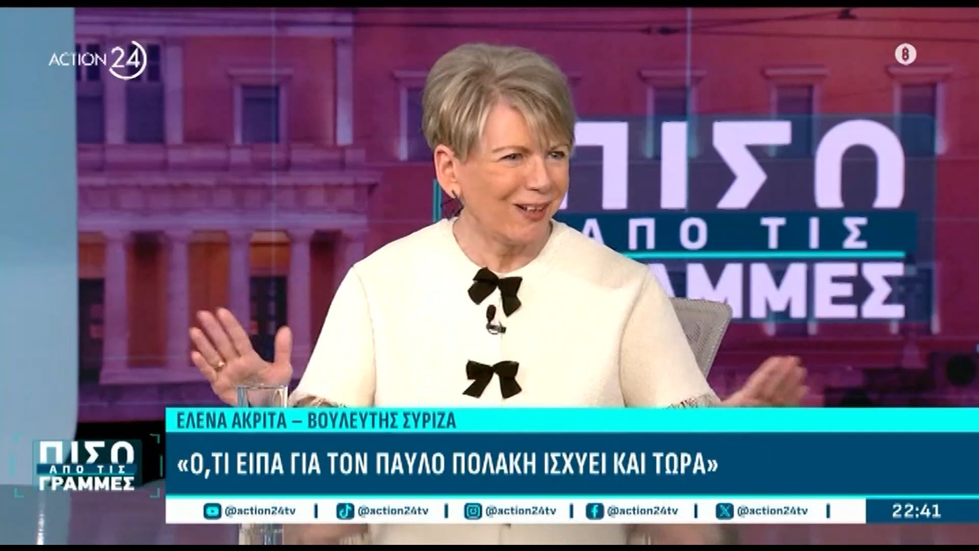 Η Έλενα Ακρίτα, βουλευτής του ΣΥΡΙΖΑ, εξέφρασε την ανησυχία της σχετικά με την ενδεχόμενη ηγεσία του Πολάκη στο κόμμα. Σε δηλώσεις της, τόνισε ότι εάν ο Πολάκης αναλάβει την ηγεσία, θα αποφασίσει να αποχωρήσει από την πολιτική σκηνή.
