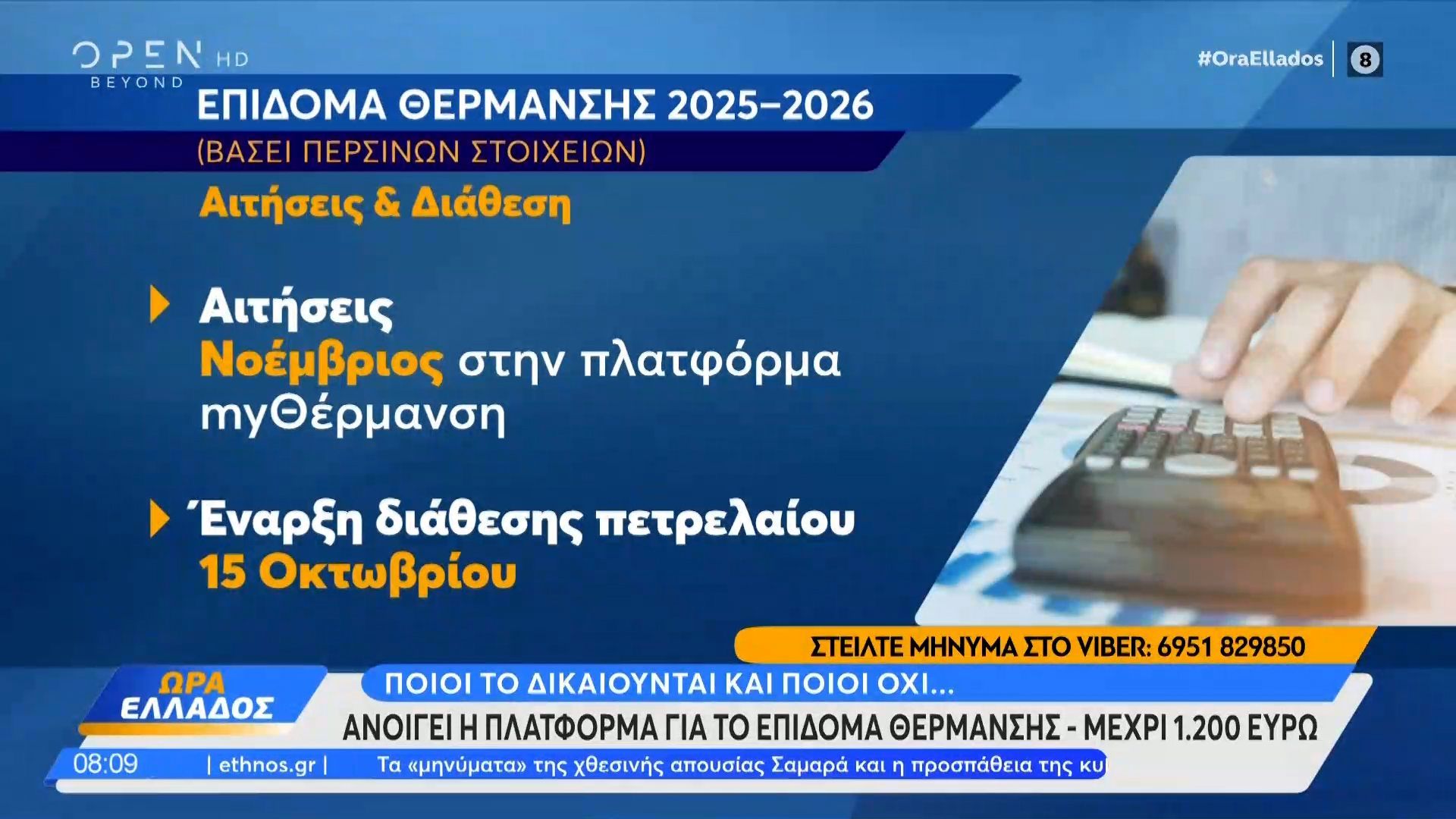 Από τον Νοέμβριο, οι ενδιαφερόμενοι μπορούν να υποβάλουν αιτήσεις για το επίδομα θέρμανσης μέσω της πλατφόρμας my θέρμανση. Το ποσό που μπορούν να λάβουν φτάνει έως και τα 1200 ευρώ, ανάλογα με τα κριτήρια που πληρούν.