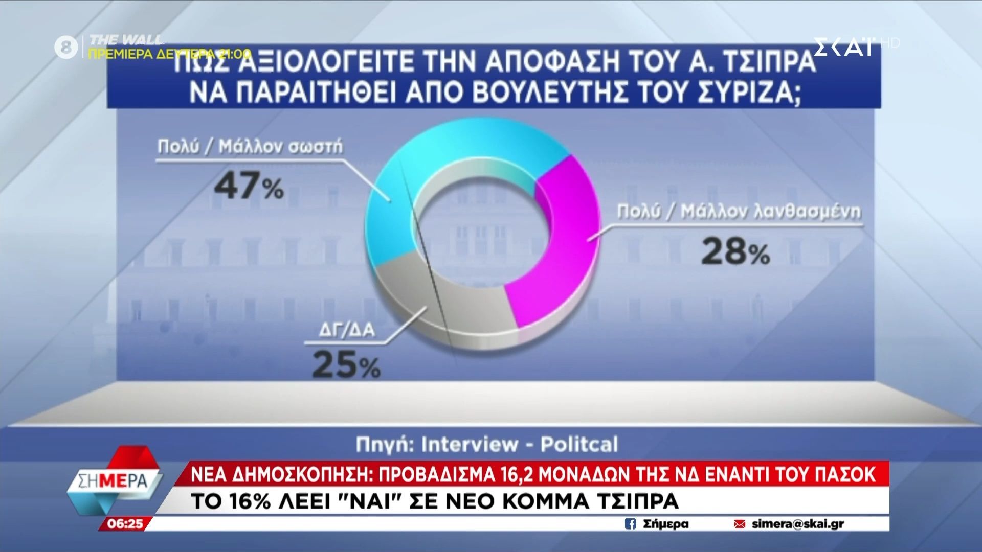 Νέα δημοσκόπηση αποκαλύπτει ότι το 16% των πολιτών εκφράζει θετική γνώμη για την πιθανότητα δημιουργίας ενός νέου κόμματος υπό την ηγεσία του Αλέξη Τσίπρα. Παράλληλα, η Νέα Δημοκρατία διατηρεί προβάδισμα 16,2 μονάδων απέναντι στο ΠΑΣΟΚ, δείχνοντας την ισχυρή θέση της στην πολιτική σκηνή.