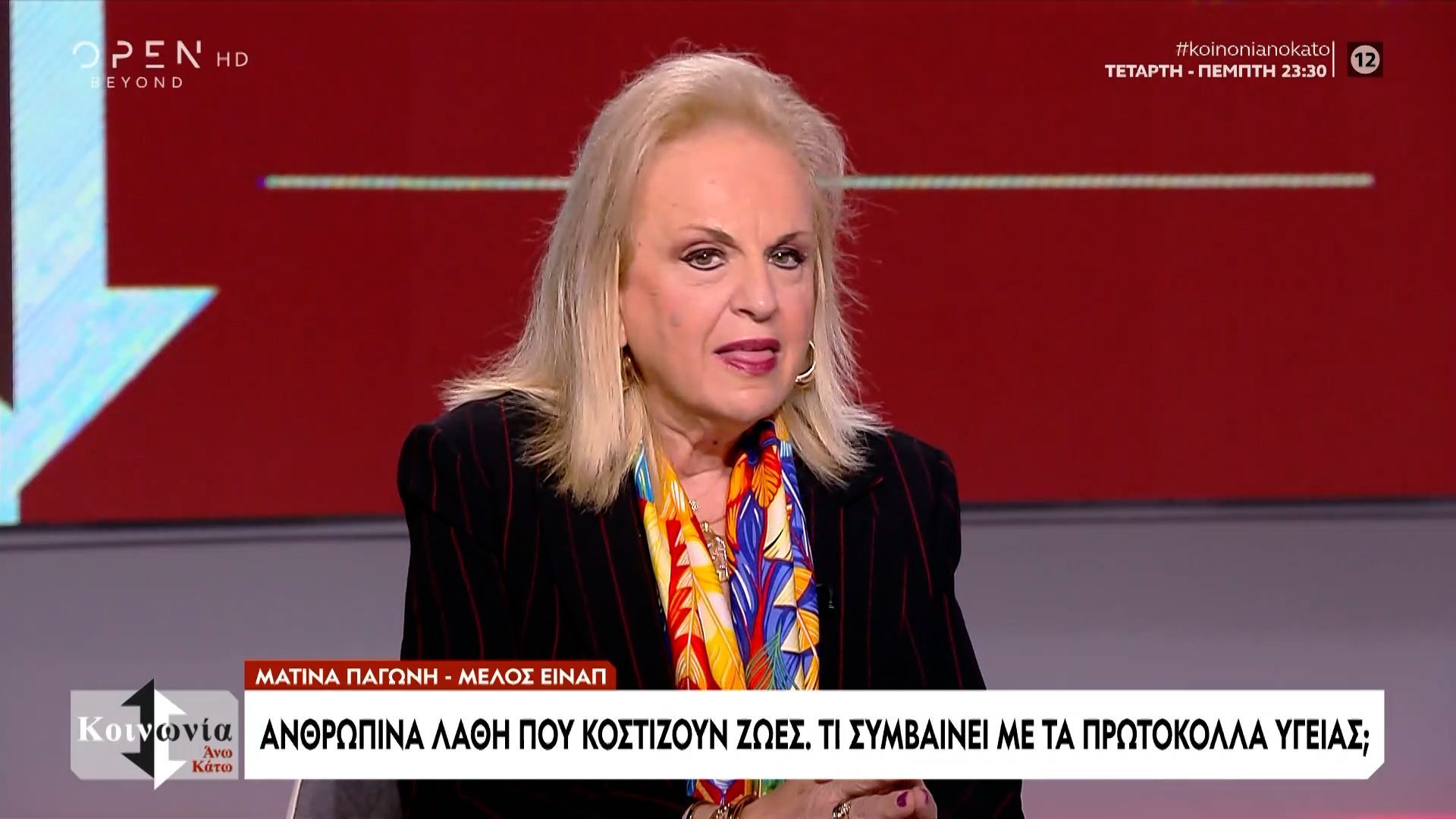Η Ματίνα Παγώνη, μέλος της ΕΙΝΑΠ, αναφέρθηκε στην εκπομπή Κοινωνία Άνω Κάτω στα σοβαρά ανθρώπινα λάθη που οδηγούν σε απώλειες ζωών. Τόνισε ότι η μη τήρηση των πρωτοκόλλων υγείας αποτελεί κίνδυνο για τη δημόσια υγεία και επισημαίνει την ανάγκη για αυστηρότερη παρακολούθηση και εκπαίδευση των επαγγελματιών του τομέα.