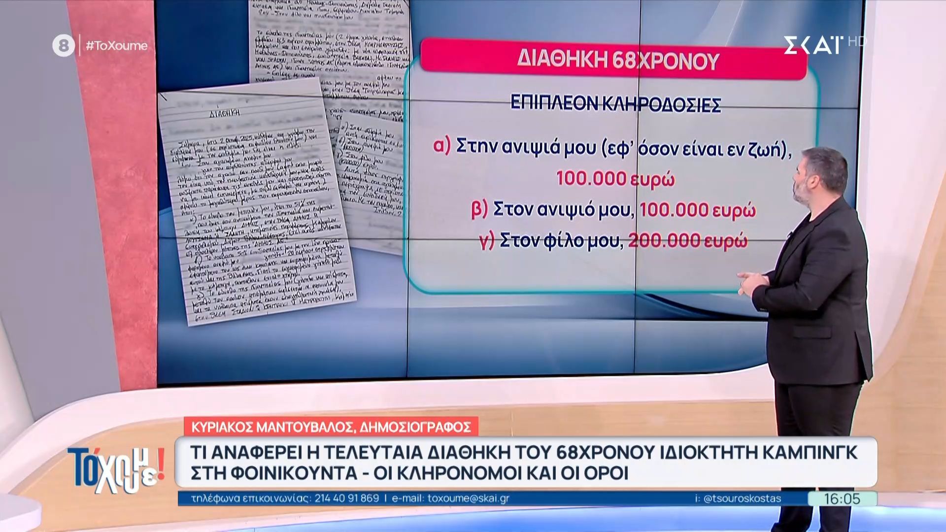 Η τελευταία διαθήκη του 68χρονου ιδιοκτήτη κάμπινγκ έχει προκαλέσει έντονο προβληματισμό μεταξύ των κληρονόμων. Οι όροι που περιλαμβάνονται στο έγγραφο ενδέχεται να αλλάξουν δραστικά την κατανομή της περιουσίας, προκαλώντας αντιπαραθέσεις και αμφισβητήσεις.