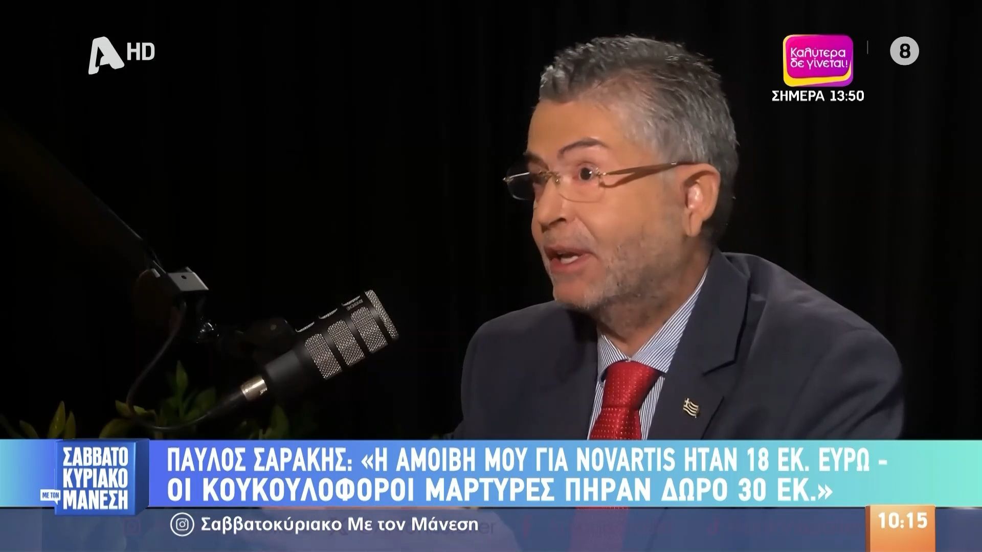 Ο Βουλευτής Π. Σαράκης προχώρησε σε δηλώσεις σχετικά με την αμοιβή του από τη φαρμακευτική εταιρεία Novartis, αποκαλύπτοντας ότι αυτή ανήλθε σε 18 εκατομμύρια ευρώ. Η αναφορά έγινε στο πλαίσιο της απάντησής του για το Πόθεν έσχες του, το οποίο έχει προκαλέσει δημόσιο ενδιαφέρον.