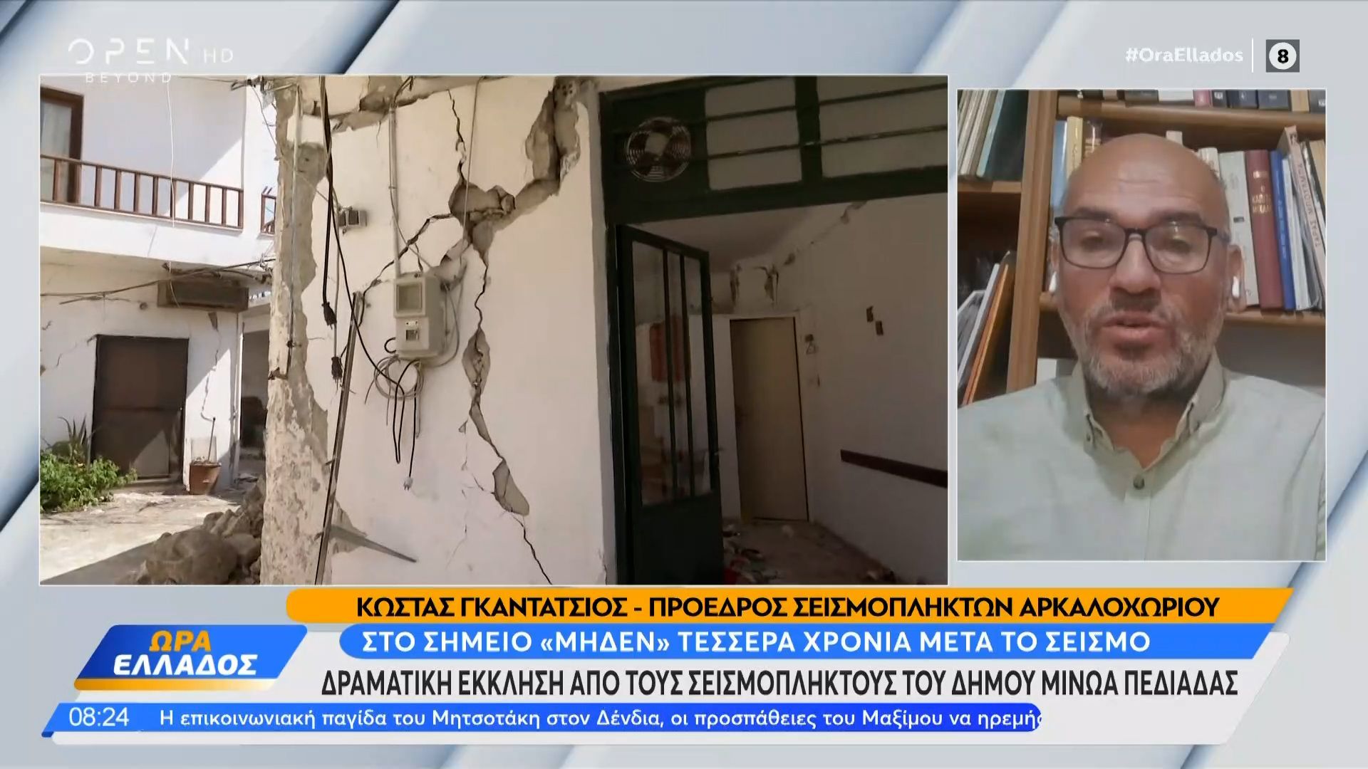 Τέσσερα χρόνια μετά τον σεισμό του 2021, η κατάσταση στο Αρκαλοχώρι παραμένει δραματική, όπως επισημαίνει ο Πρόεδρος Σεισμόπληκτων Κώστας Γκαγκανάτσιος. Περίπου 500 κάτοικοι συνεχίζουν να διαμένουν σε κοντέινερ, ενώ δύο σχολικά συγκροτήματα βρίσκονται επίσης σε προσωρινές εγκαταστάσεις.