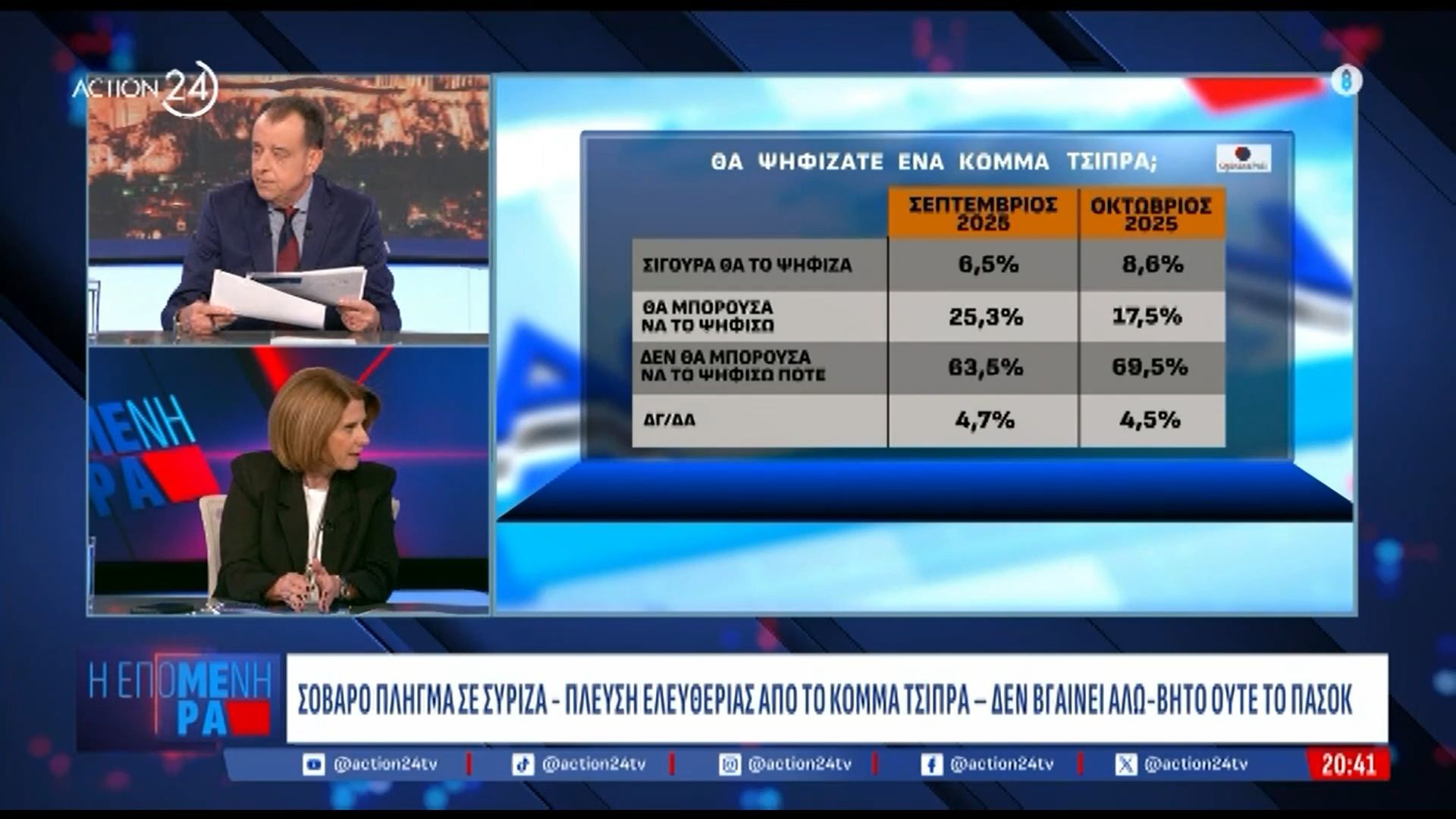 Αμαλία Κάτζου και Νίκος Ελευθερόγλου αναλύουν τα ευρήματα της πρόσφατης δημοσκόπησης που διεξήχθη από το Action24 και την Opinion Poll. Οι ειδικοί εξετάζουν τις τάσεις της κοινής γνώμης και τις προτιμήσεις των πολιτών, προσφέροντας μια σαφή εικόνα της πολιτικής σκηνής.