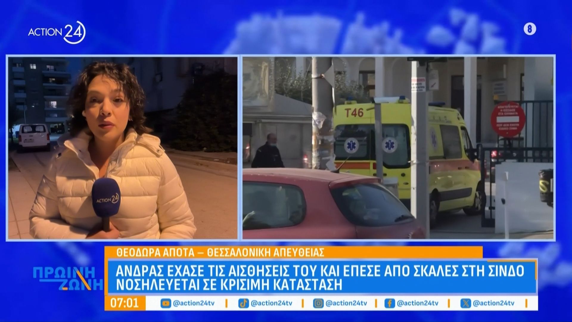 Στην περιοχή της Σίνδου, ένας άνδρας έχασε τις αισθήσεις του και έπεσε από σκάλες, με αποτέλεσμα να τραυματιστεί σοβαρά. Οι αυτόπτες μάρτυρες ανέφεραν ότι ο άνδρας φαινόταν να νιώθει αδιαθεσία πριν την πτώση του, γεγονός που οδήγησε στην άμεση κινητοποίηση των ασθενοφόρων.