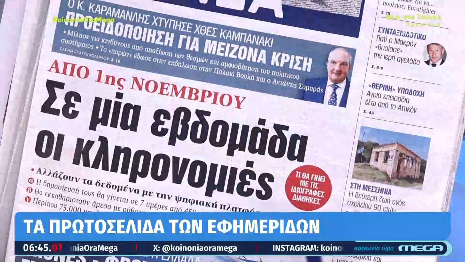 Σήμερα αναλύονται τα κύρια θέματα που απασχολούν τις εφημερίδες, προσφέροντας μια ολοκληρωμένη εικόνα της επικαιρότητας. Οι πολιτικές εξελίξεις, η οικονομική κατάσταση και οι κοινωνικές προκλήσεις είναι σε πρώτο πλάνο, με έμφαση στις σημαντικές δηλώσεις των πολιτικών προσώπων.